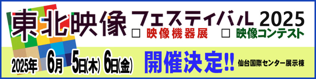 「東北映像フェスティバル2025(映像機器展・映像コンテスト)」は、2025年6月5日(木)と6日(金)の2日間にわたり、仙台国際センター展示棟で開催されます。このイベントは映像機器展示と映像コンテストを含み、映像に関する最新の技術や才能を紹介する場となります。ぜひご期待ください!!